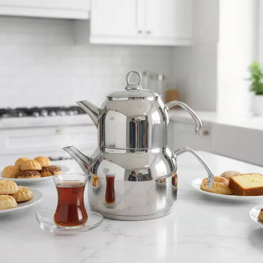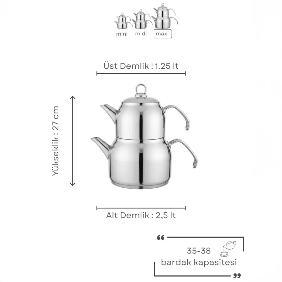 Valeriya Metal Kulplu Aile Boy Çaydanlık, yüksek kaliteli paslanmaz çelik malzemeden üretilmiş olup dayanıklı yapısı ve şık tasarımıyla öne çıkar. 1,25 litre kapasiteli demlik ve 2,5 litre su haznesi sayesinde kalabalık aileler ve misafir kullanımı için geniş bir kapasite sunar.