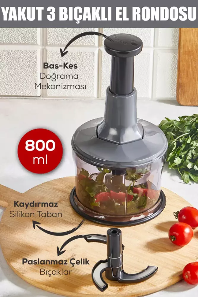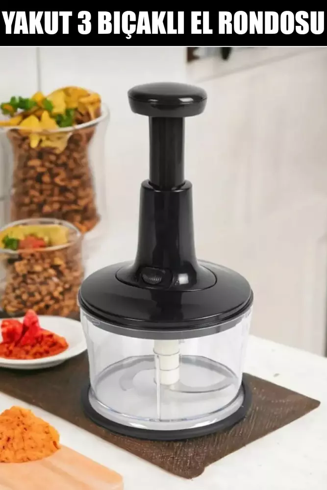 Yakut Basmalı Büyük 3 Bıçaklı El Rondosu, mutfakta hızlı ve pratik doğrama çözümleri sunar. Üç adet paslanmaz bıçağı ile sebze, meyve ve baharatları kısa sürede ve eşit boyutlarda doğramaya yardımcı olur. Basmalı mekanizması sayesinde tek elle kullanım kolaylığı sağlar, güvenli ve ergonomik tasarımı ile el yorgunluğunu azaltır.